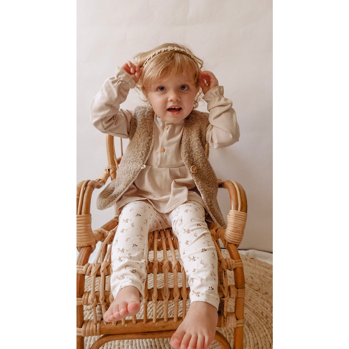 A super cute waistcoat made of soft teddy. The trend of today! Lined with cotton on the inside and fitted with a wooden button. For example, combine with a ruffle rib shirt from our collection and skinny leggings to complete the outfit. Don't you want this must-have for your little one!?
