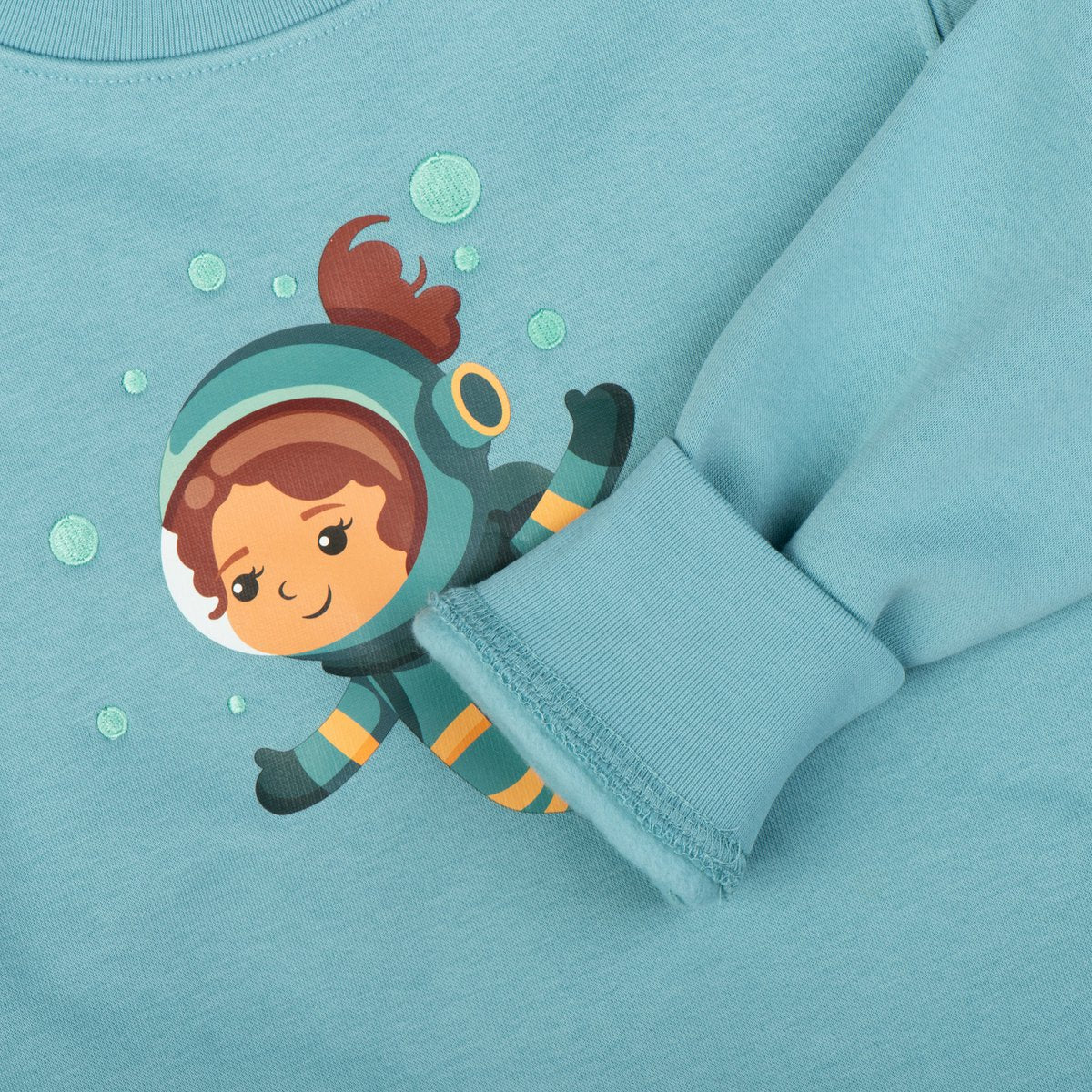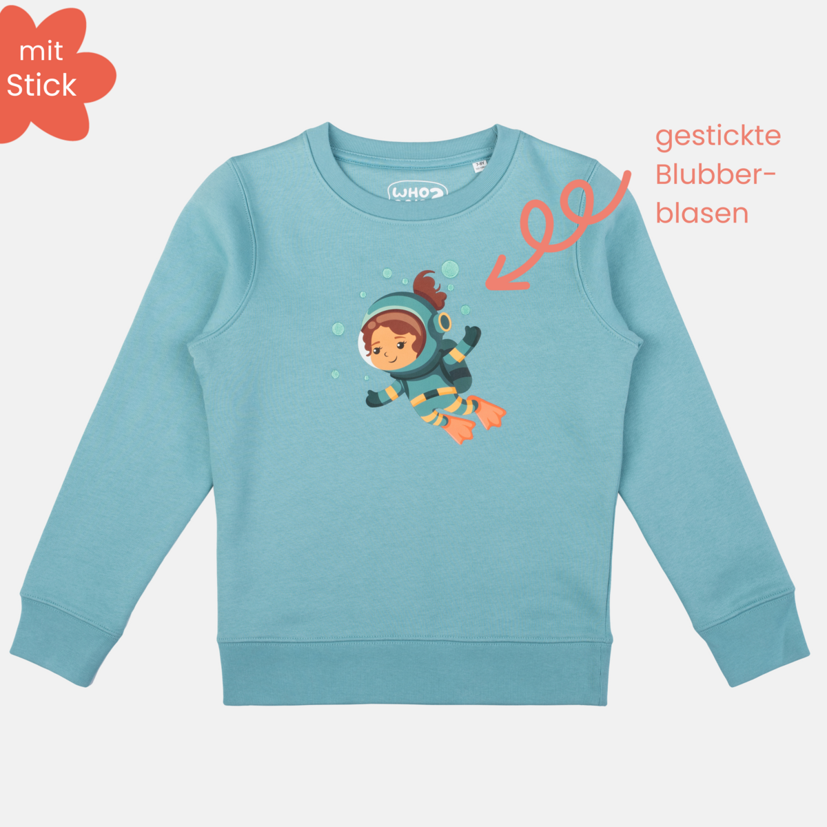 Our sweater "Fantastic Ocean" is characterized by the brave adventures of fearless sea researchers. Our diver goes on a journey of discovery into the depth of the ocean in order to gain valuable knowledge for marine biology and make a contribution to science. The front of the turquoise sweater shows the imprint of a sea researcher that immerses in the deep sea. The turquoise bubbles are embroidered and stand out slightly. At the hem of the back is our WHO SAID brand label with the motto "All Colors are for Everyone". Women are still underrepresented in marine research as well as in other MINT specialist areas (mathematics, computer science, natural science, technology). We need role models that show girls that they too can successfully practice these professions. Our research diver is intended to encourage young women to develop their curiosity and her spirit of discovery and never give up. By acquiring this sweater, your children not only receive a high quality and sustainable garment, but also a source of inspiration and motivation to overcome borders and to realize their dreams. Because today's girls are the female executives and discoverers of tomorrow. The cozy sweater is produced under fair and environmentally friendly conditions and consists of 85% certified organic cotton and 15% recycled PET.