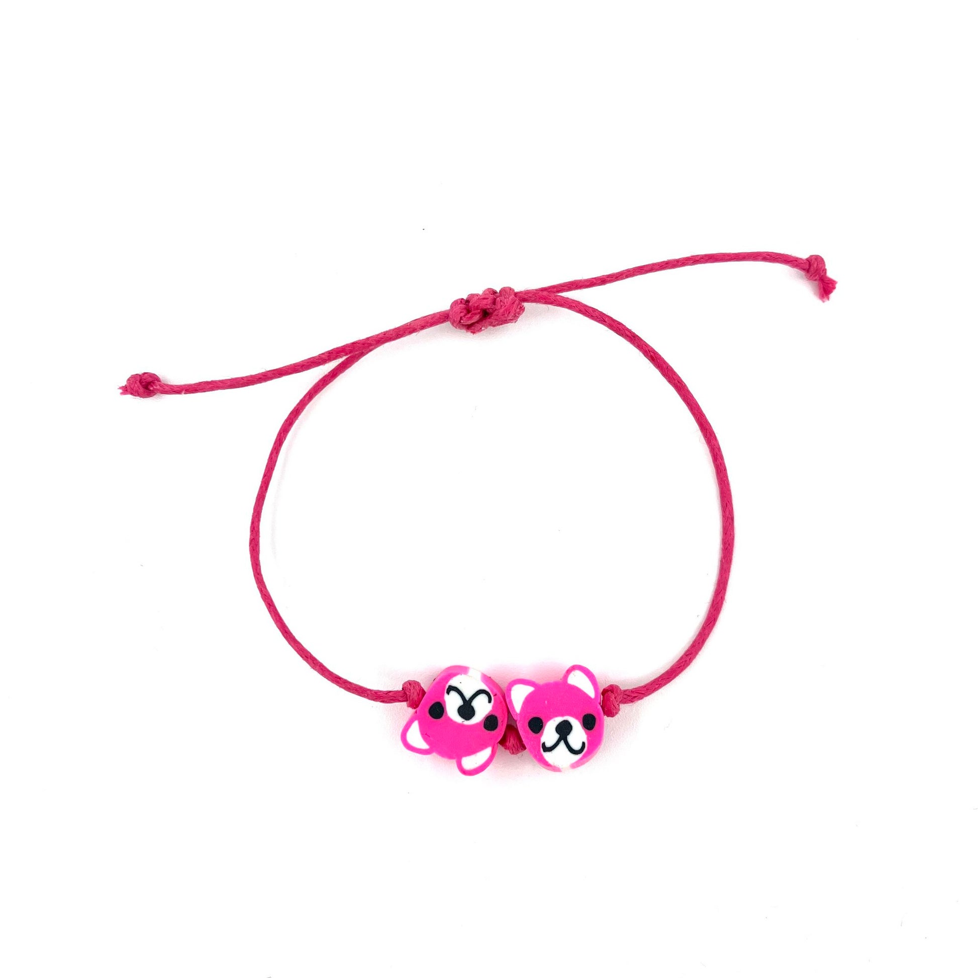 This sustainable children’s bracelet with two bear beads has a pinkcord, that looks cheerful on your wrist. This bracelet has an easy sliding button closure and is suitable for children