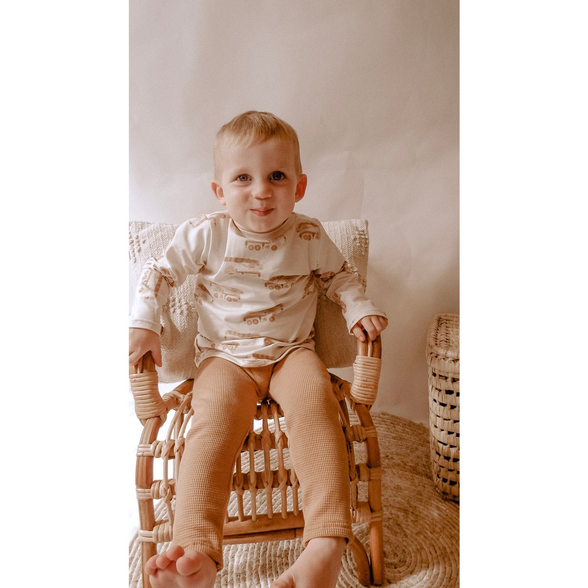 These pants are made of a supple jersey that is easy to combine with one of the plain wrap-over shirts or blouses. The soft fabric makes the pants easy to put on and your little one can move freely in them. The leggings are also nice to combine with a newborn hat or headband in the same print.