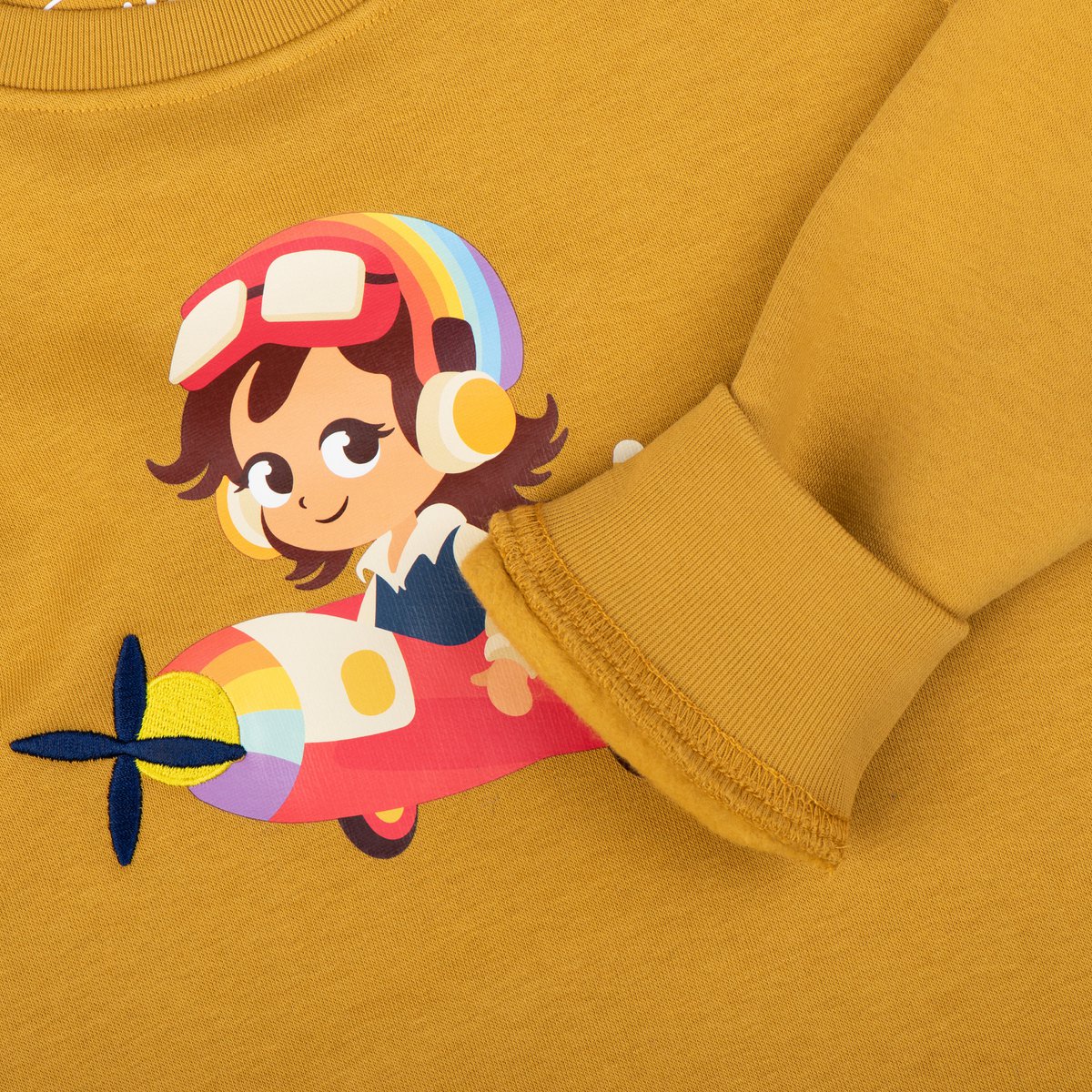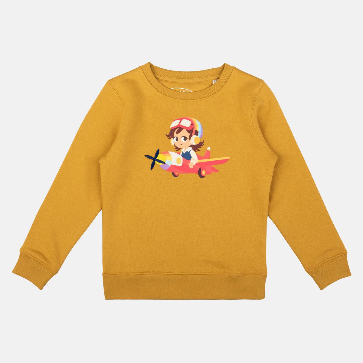 When you're in the sky, all boundaries seem to be removed. The world beneath you shrinks and a universe full of possibilities opens up. Flying offers a unique perspective that inspires and inspires you. Many children have the dream of one day sitting at the controls of an airplane themselves. We especially want to encourage girls and show them that these dreams can become reality. The front of the ocher sweater has a print of a pilot above the clouds. The embroidered propeller stands out slightly visually. Above the back hem is our Who said brand label with the motto "All Colors Are For Everyone". Many professional fields are still dominated by men today. Women also continue to be underrepresented in commercial aviation. Role models are needed to show young girls that women can be just as successful as men in these professions and that there are no limits. Our pilot aims to encourage girls to develop their curiosity and spirit of discovery and to never give up. By purchasing this sweater, your children will not only receive a high-quality and sustainable piece of clothing, but also a source of inspiration and motivation to overcome limitations and achieve their dreams. Because the girls of today are the female leaders and explorers of tomorrow. The cozy sweater is produced under fair and environmentally friendly conditions and consists of 85% certified organic cotton and 15% recycled PET.