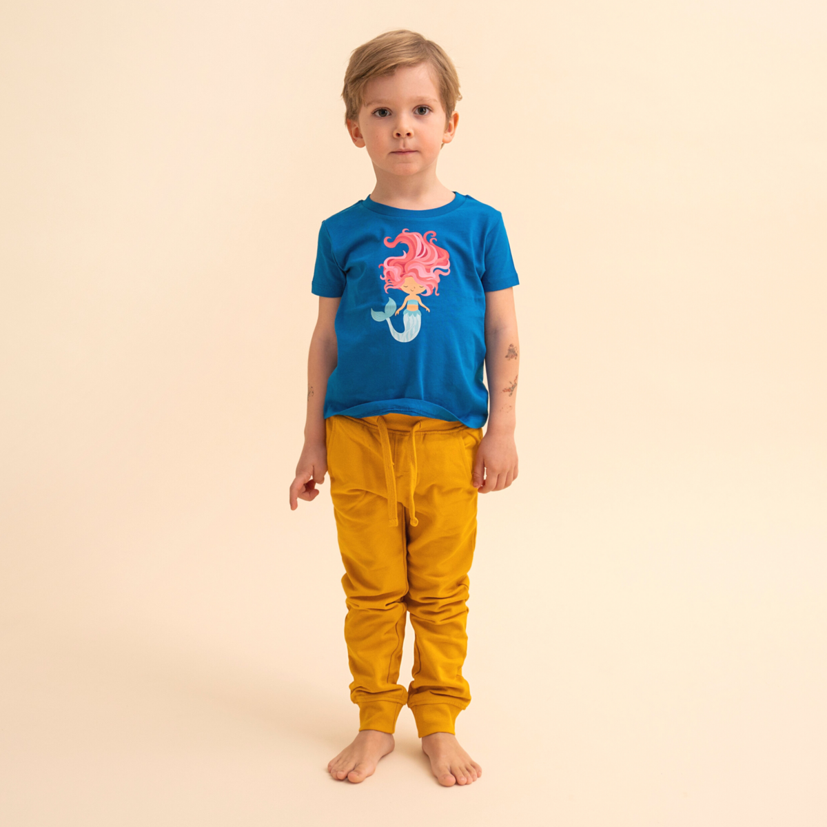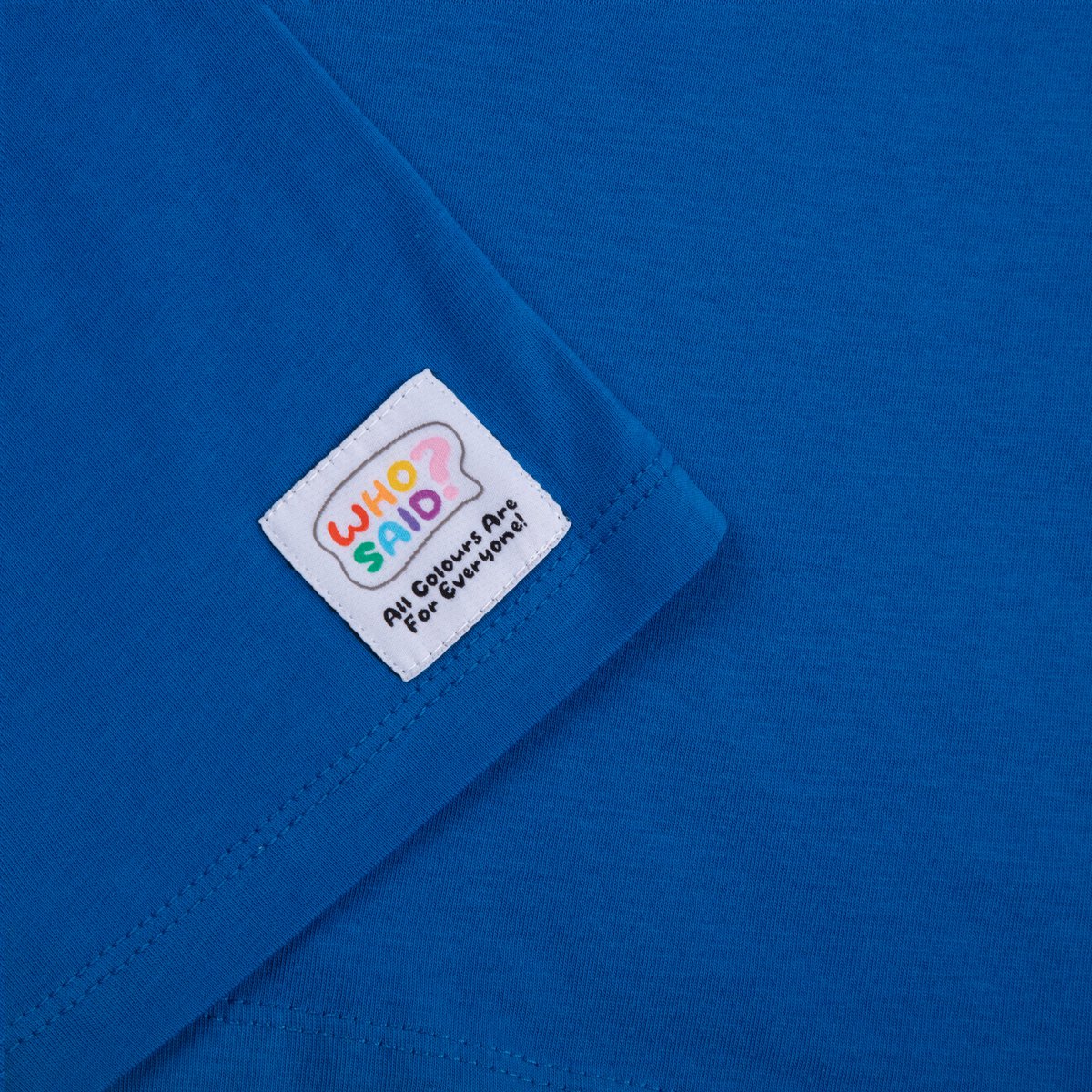 Merpeople have always had a special attraction for children. Adventurous, mysterious and strong, they live in the mysterious depths of the ocean. Does it really not exist or has no one discovered it yet? However. Our curious mermaid with wild hair definitely symbolizes exactly what we want to pass on to our children: you can be exactly who you are. The front of the strong blue shirt is decorated with a pretty print of a little mermaid. The Who said brand label with our heartfelt message "All Colors Are For Everyone" can be found above the hem on the back. The shirt is made of 100% certified organic cotton and was manufactured under fair and ecological conditions.