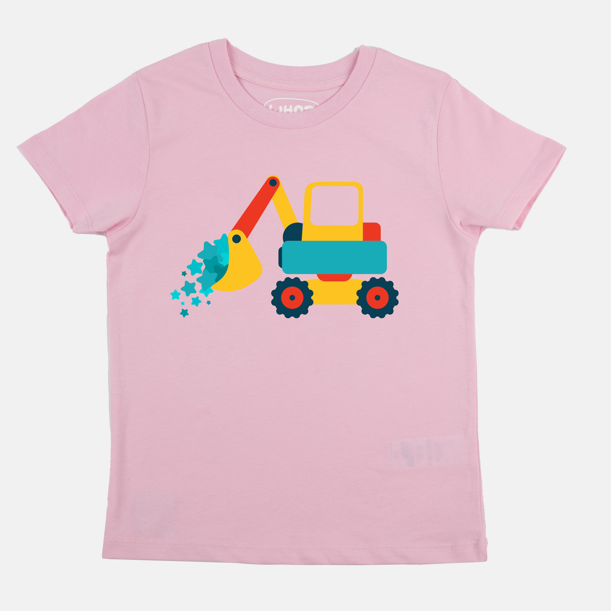 Who said diggers are just for boys? We think the excavator t-shirt looks fantastic on all children. The excavator symbolizes building new paths and breaking boundaries, encouraging you to always be authentic and choose your own paths. A powerful message that we love. The front of the pink T-shirt is decorated with a print of a yellow excavator, which inspires children to build their own little construction site in the world of play and imagination. On the back, above the hem, we have placed our Who said brand label with the motto "Colours Are For Everyone". The high-quality T-shirt was manufactured under fair and ecological conditions. It is made of 100% certified organic cotton, making it a sustainable and responsible garment. It's important to us that children's clothing not only looks cool, but also represents the values we stand for.