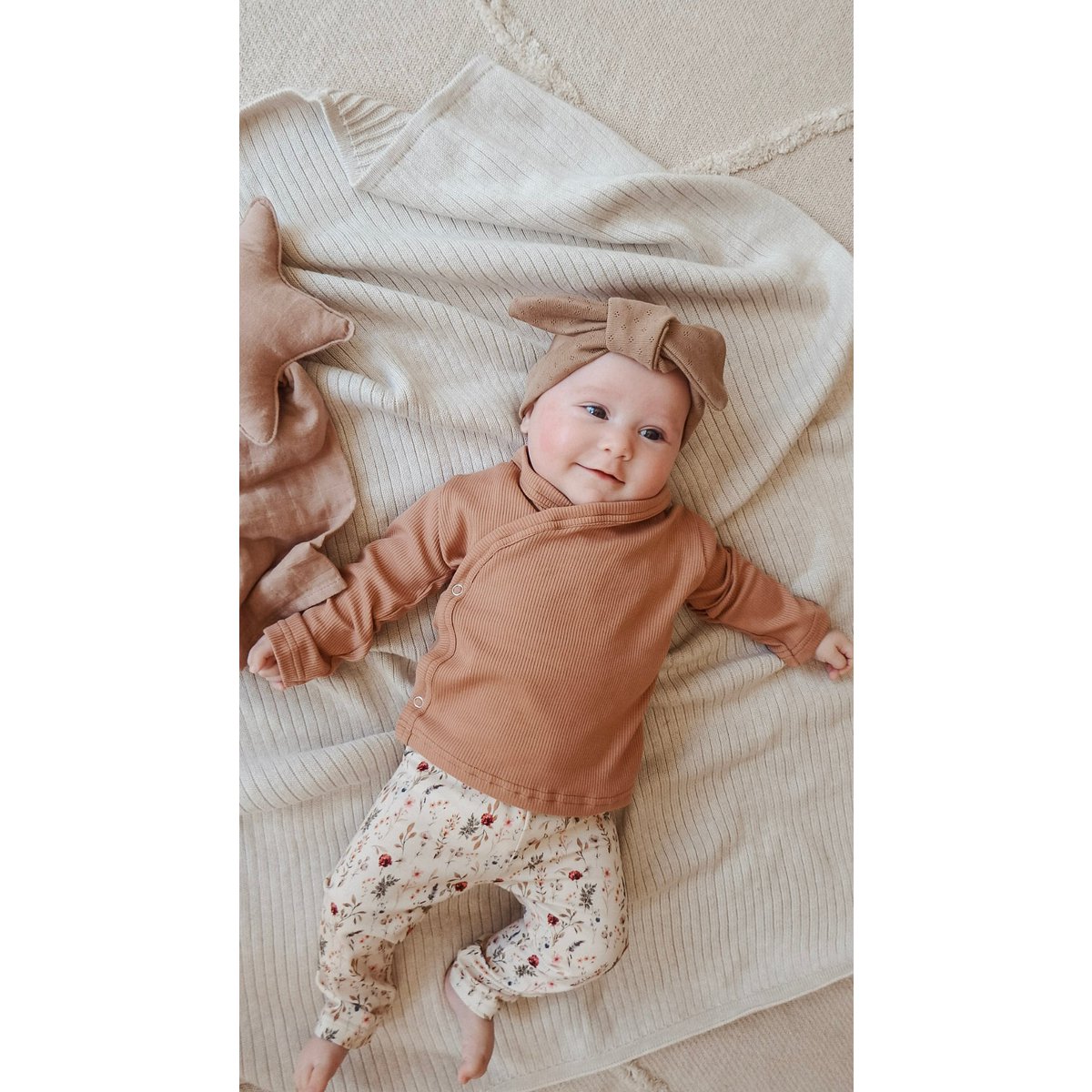 These pants are made of a supple jersey that is easy to combine with one of the plain wrap-over shirts or blouses. The soft fabric makes the pants easy to put on and your little one can move freely in them. The leggings are also nice to combine with a newborn hat or headband in the same print.
