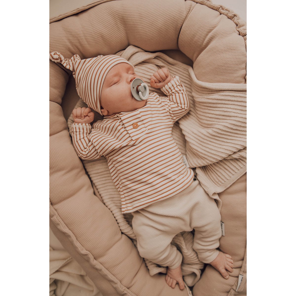 These pants are made of a supple jersey that is easy to combine with one of the plain wrap-over shirts or blouses. The soft fabric makes the pants easy to put on and your little one can move freely in them. The leggings are also nice to combine with a newborn hat or headband in the same print.