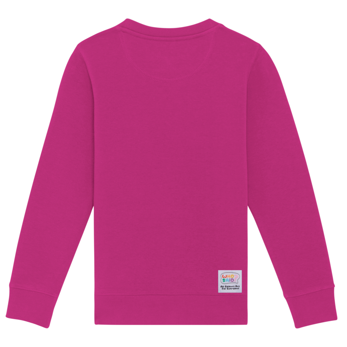 Who says dinosaurs are just for boys? And pink is a color for girls? Boys and girls can love and wear our berry-colored sweater with dinosaurs equally. Every child should have the freedom to wear the colors and motifs they like. With his charming smile and party hat, our dinosaur invites everyone to start their own dinosaur party. The front of the berry-colored sweater is printed with a friendly T-Rex wearing a party hat. Above the back hem is our brand label, which features our motto "Colours Are For Everyone". The high-quality and cuddly soft sweater was produced under fair and ecological conditions. It is made from 85% certified organic cotton and 15% recycled PET, making it a sustainable and responsible garment.