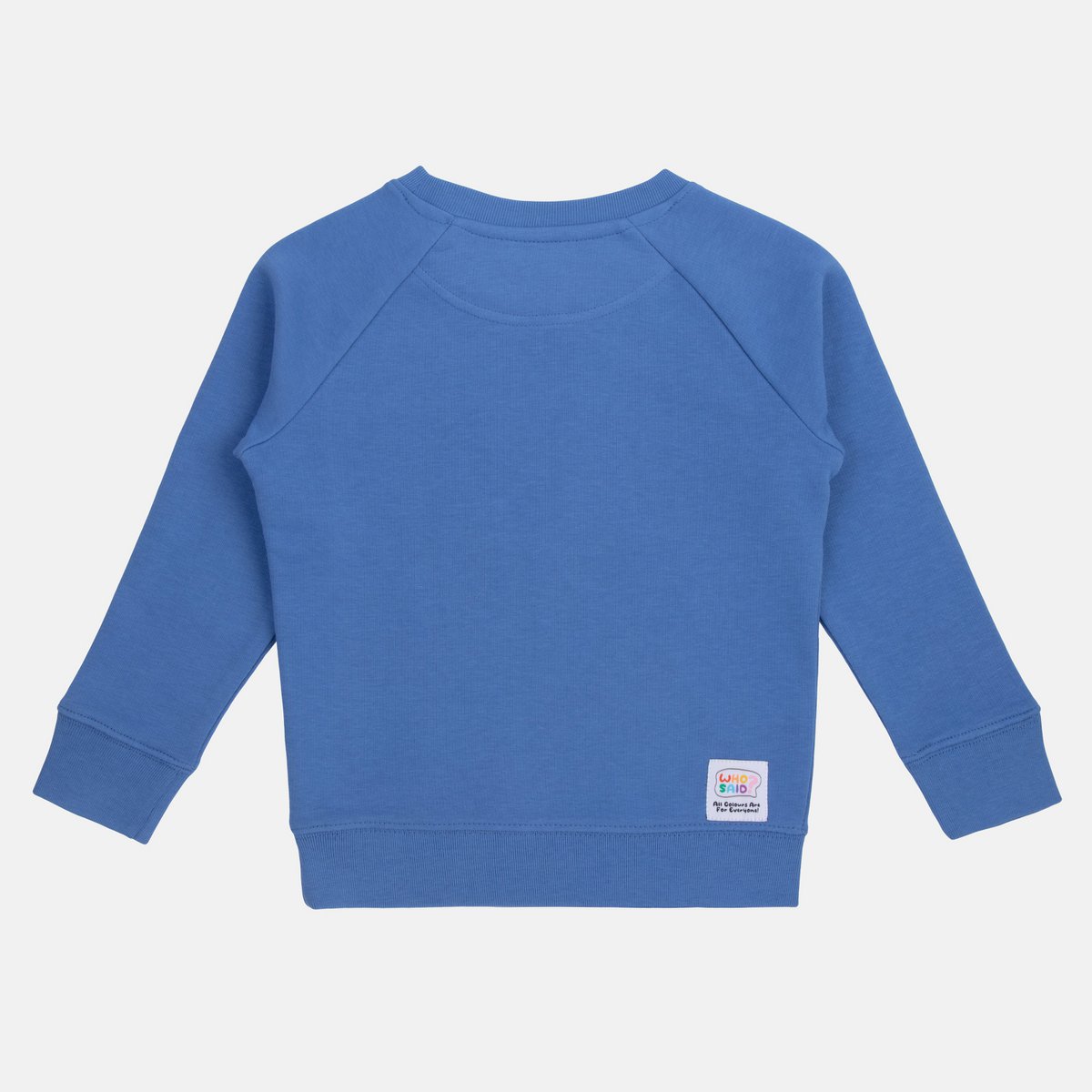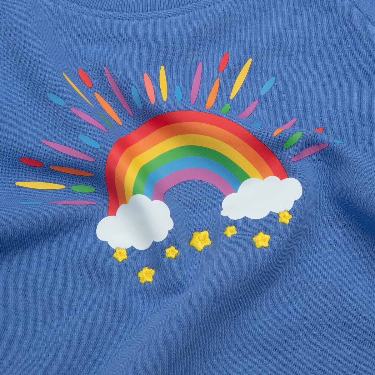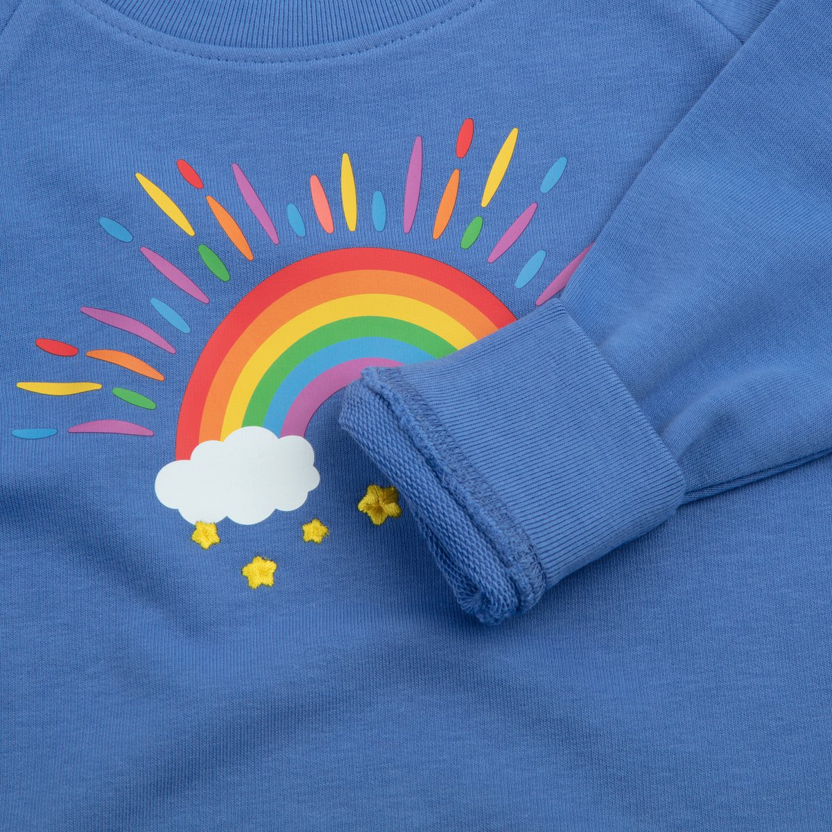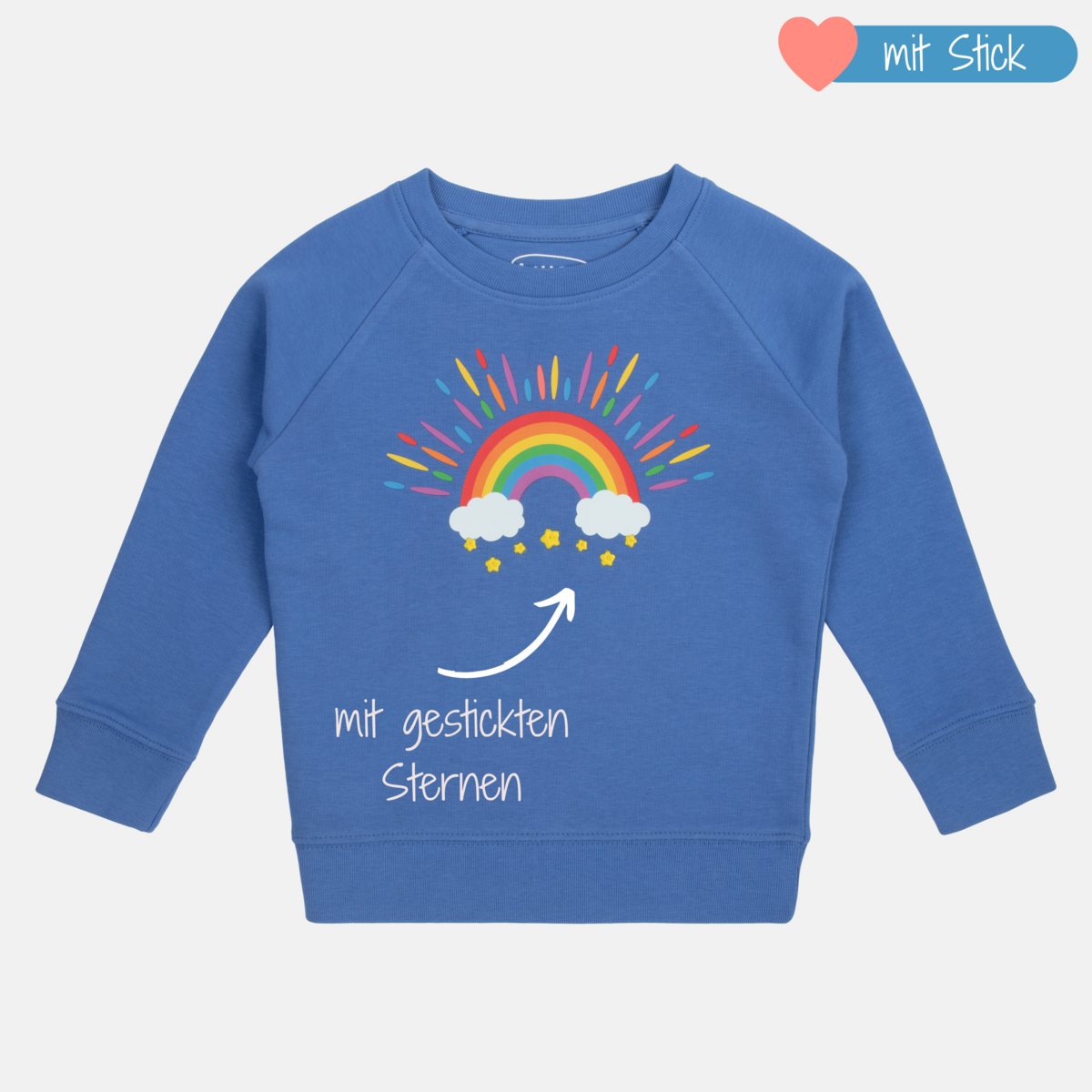 Our favorite motif, the rainbow, is now also available as a comfortable sweater with embroidered stars. Rainbows simply bring us joy and make us forget the cold and rain. They are a symbol of openness, tolerance and diversity - values that we want for our children. We are all unique and amazing just the way we are! A bright rainbow motif is printed on the front of the blue sweatshirt. On the back, above the hem, is the Who said brand label with our motto "All Colors Are For Everyone". This comfortable sweatshirt has a wide neckline and was manufactured under fair and environmentally friendly conditions. It is made from 85% certified organic cotton and 15% recycled PET.
